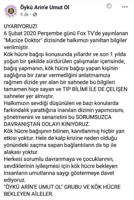 Öykü Arin'e Umut Ol Grubu ve Kök Hücre Bekleyen Aileler tarafından yapılan ortak açıklamada şu ifadeler kullanıldı; "UYARIYORUZ! 6 Şubat 2020 Perşembe günü Fox TV'de yayınlanan "Mucize Doktor" dizisinde halkımızı yanıltan bilgiler verilmiştir. Kök hücre bağışı konusunda yıllardır ve son 1 yılda yoğun bir şekilde sürdürülen çalışmalar içerisinde, bağış yapmanın, kök hücre bağışı yapan kişinin sağlığına bir zarar vermediğini anlatmamıza rağmen dizide yer alan bir sahnede bu bilgileri tamamen hiçe sayan ve TIP BİLİMİ İLE DE ÇELİŞEN sahneler yer almıştır. Halkımızın sevdiği düşünülen ve bazı konularda farkındalık yarattığına inanılan dizinin yapımcısını, yönetmenini ve senaristini bu SORUMSUZCA DAVRANIŞTAN DOLAYI KINIYORUZ. Kök hücre bağışının bilinen, kanıtlanmış hiçbir yan etkisi yoktur. Hele de kalp krizine neden olduğu yönündeki saçma sapan bağlantıların da tıp ile alakası yoktur.Herkesi sorumlu davranmaya ve çocuklarının, sevdiklerinin iyileşmesi için kök hücre bekleyen insanların umutlarına saygı göstermeye davet ediyoruz."
