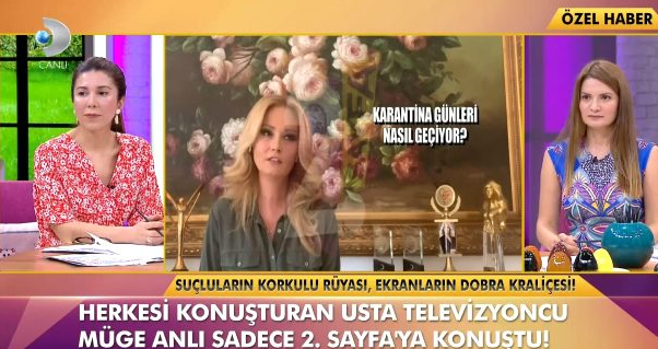 'Müge ve Gülşen'le 2. Sayfa' programına verdiği röportajla gündeme gelen Anlı, karantina günlerinde neler yaptığını ve sonraki süreçte neler yapacağını tüm samimiyetle paylaştı. Dünya üzerinde binlerce insanın dünyasını değiştiren milyarlarcasını evde karantinaya hapseden Korona virüs salgınından etkilenen Müge Anlı, karantina günlerinde evden çıkmıyor. Programı yayından kaldırıldığı için evinde karantina altında olan ünlü sunucu bir ilki gerçekleştirdi. Kanal D ekranlarında yayınlanan Müge ve Gülşen’le 2. Sayfa programına röportaj verdi ve hakkında merak edilenleri içtenlikle yanıtladı.