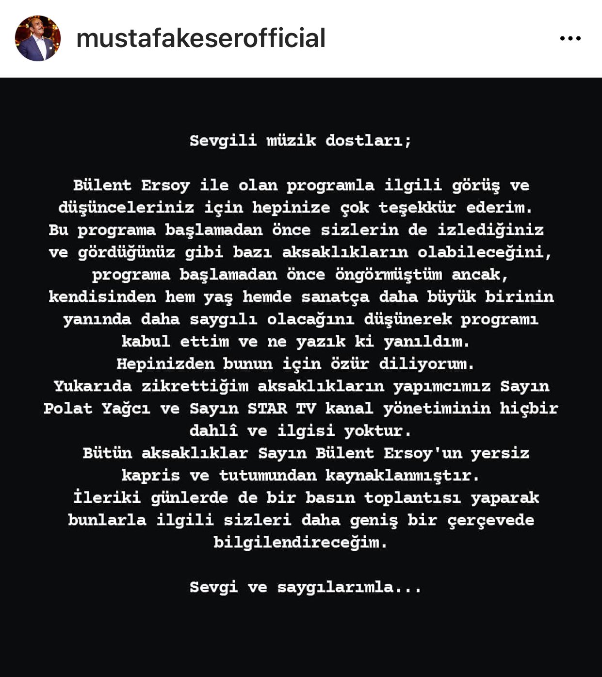 Yıllardır canlı yayınlar yaptığını söyleyen Mustafa Keser, Bülent Ersoy'un kaprislerini de anlattı. Bülent Ersoy'un artık şarkı okuyamadığını iddia eden Keser, "Yönetmene bağırır, ona bağırır, şefe bağırır, okuyamaz döner vokale bağırır. Uyamayan Bülent Hanım. Zaten ses kalmamış, rezalet bir okuyuş. Orada dönüp çocuklara bakıyor. Sanıyorsunuz ki vokaller okumuyor. Bunun arkasından üçüncü programında baktım orada burada konuklar çağırılmış. Biz sanki orada sunucuyuz. Gelen konuğun biri 9 şarkı, biri 8 şarkı. Bana vermişler 3 şarkı, Bülent'e vermişler 5 şarkı. Onun üzerine sinirlendim" açıklamasında bulundu.