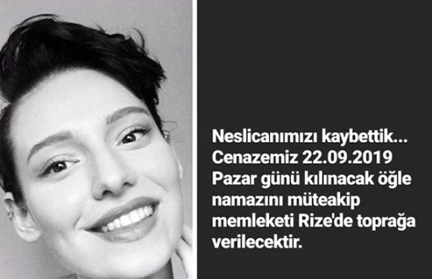 Vefatıyla tüm Türkiye'yi yasa boğan Neslican'ın ailesi ise acı kayıplarının ardından cenaze ile ilgili detayları paylaştı. Sosyal medyadan ''Neslican'ımızı kaybettik. Cenazemiz 22.09.2019 Pazar günü kılınacak öğle namazına müteakip memleketi Rize'de toprağa verilecektir.'' notuyla kızları Neslican'ın yarın memleketi Rize'de defnedileceğini duyurdu.