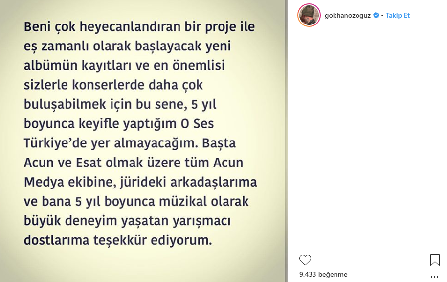 "Beni çok heyecanlandıran bir proje ile eş zamanlı olarak başlayacak yeni albümün kayıtları ve en önemlisi sizlerle konserlerde daha çok buluşabilmek için bu sene, 5 yıl boyunca keyifle yaptığım O Ses Türkiye’de yer almayacağım. Başta Acun ve Esat olmak üzere tüm Acun Medya ekibine, jürideki arkadaşlarıma ve bana 5 yıl boyunca müzikal olarak büyük deneyim yaşatan yarışmacı dostlarıma teşekkür ediyorum."
