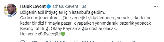 Organize ettiği sosyal sorumluluk projeleriyle 7’den 77’ye herkesin takdirini kazanan Haluk Levent, bölgenin acil ihtiyaçları için İstanbul’a geldi. 10 ilimizde bulunan milyonlarca depremzedenin önümüzdeki süreçte acil ihtiyaç duyduğu malzemeler için İstanbul’a gelen Levent burada çadırdan jeneratöre, güneş enerjisi şirketlerinden, yemek şirketlerine kadar bir dizi firmayla çatır çatır pazarlık yapacağını duyurdu. Sıkı pazarlık yapmalarıyla tanınan Kıvanç Tatlıtuğ ve Oktay Kaynarca’dan yardım isteyen Haluk Levent iki sanatçıdan da olumlu cevap aldı.