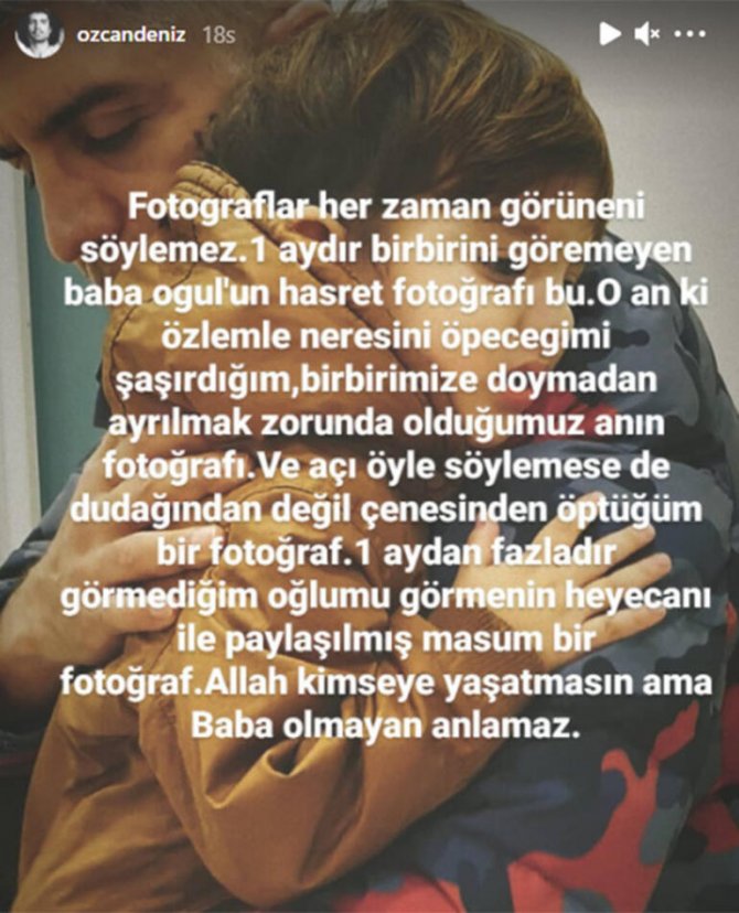 birbirimize doyamadan ayrılmak zorunda olduğumuz anın fotoğrafı. Ve açı öyle söylemese de dudağından değil çenesinden öptüğüm bir fotoğraf! Bir aydan fazladır görmediğim oğlumu görmenin heyecanı ile paylaşılmış masum bir fotoğraf. Allah kimseye yaşatmasın ama baba olmayan anlamaz" ifadelerine yer verdi.