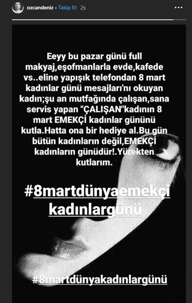 Canlitv platformu olarak Özcan Deniz imzalı skandal 8 Mart paylaşımını sorumluluk gazeticilik anlayışıyla aynen paylaşıyoruz. "Eyy bu pazar günü full makyaj, eşofmanlarla evde, kafede vs. eline yapışık telefondan 8 Mart Kadınlar Günü mesajlarını okuyan kadın; şu an mutfağında çalışan, sana servis yapan 'çalışan' kadının 8 Mart Emekçi Kadınlar Günü'nü kutla. Hatta ona bir hediye al. Bugün bütün kadınların değil, emekçi kadınların günüdür. Yürekten kutlarım."