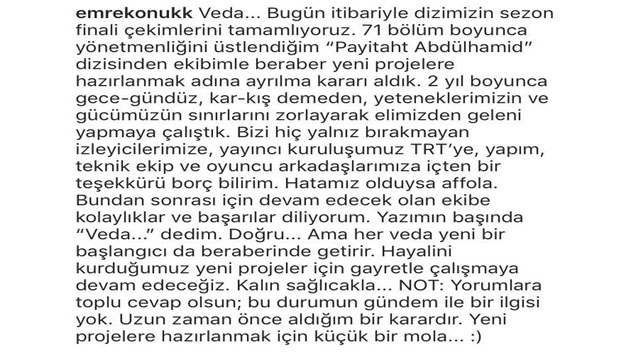 TRT 1’de yayınlanan Payitaht Abdülhamit dizisinin yönetmeni ve ekibi diziden ayrılıyor. Dizinin başrol oyuncusu Bülent İnal ve yönetmeni Emre Konuk haberi sosyal medya hesaplarından duyurdu. Dizinin yönetmeni Emre Konuk, kendisinin ve ekibinin yeni sezonda Payitaht Abdülhamit’te olmayacaklarını duyurdu. Takipçiler, bu vedayı son tanıtımda yer alan bir sahnenin eski Cumhurbaşkanı Abdullah Gül ve eski başbakan Ahmet Davutoğlu’na verilen mesajla ilgili tartışmalara bağladı. Ancak yönetmen Konuk, vedasının gündemdeki tartışma ile ilgisi olmadığını, önceden alınmış bir karar olduğunu belirtti. Dizinin başrol oyuncusu Bülent İna isel yönetmen Emre Konuk ve ekibine sosyal medya hesabından yaptığı paylaşımla teşekkür etti.