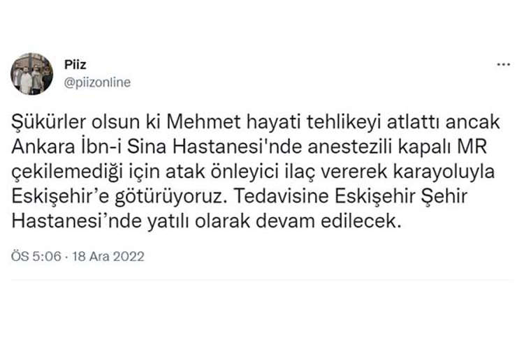 En son Piiz grubu sosyal medya hesabından yayınladığı mesajda Eskişehir Şehir Hastanesinde tedavisine devam edilen Mehmet Dudarık’ın hayati tehlikeyi atlattığını ve yatılı olarak tedavisinin devam ettiğini duyurdu.