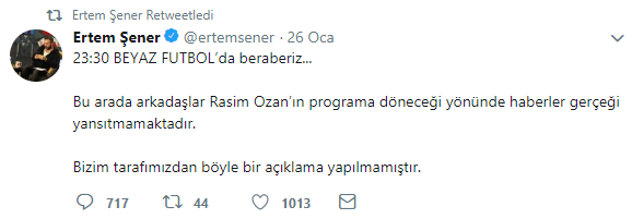 Programın sunucusu Ertem Şener'in sosyal medya hesabından paylaştığı bir video, Rasim Ozan Kütahyalı'nın Derin Futbol'a geri dönüşü olarak yorumlandı. Kısa sürede videoya binlerce tepki gelirken, Ertem Şener "23:30 BEYAZ FUTBOL’da beraberiz... Bu arada arkadaşlar Rasim Ozan’ın programa döneceği yönünde haberler gerçeği yansıtmamaktadır. Bizim tarafımızdan böyle bir açıklama yapılmamıştır" yorumuyla iddiaları yalanladı.