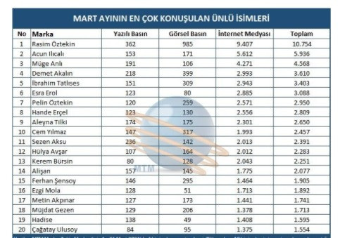 Hukukçu kişiliğini konuşturan gazeteci Müge Anlı, çözdüğü vakalarla Mart ayında 4 bin 568 habere adını yazdırdı. Genç yaşta şöhret olan ancak garip çıkışlarıyla şöhreti taşıyamayan Aleyna Tilki de gündemi en çok işgal edenlerden biriydi. Genç yetenek, Demet Akalın’ın yaptığı “Dünya starı olacağım dedi, çocuk dizisinde oynuyor” açıklamasıyla toplam 2 bin 650 habere konu oldu. Her yaptığı olay olan usta komedyen Cem Yılmaz ise yaşanan bir yangın sonucu Mart ayında 2 bin 457 haberde yer alarak yine kendisinden söz ettirmeyi başardı.