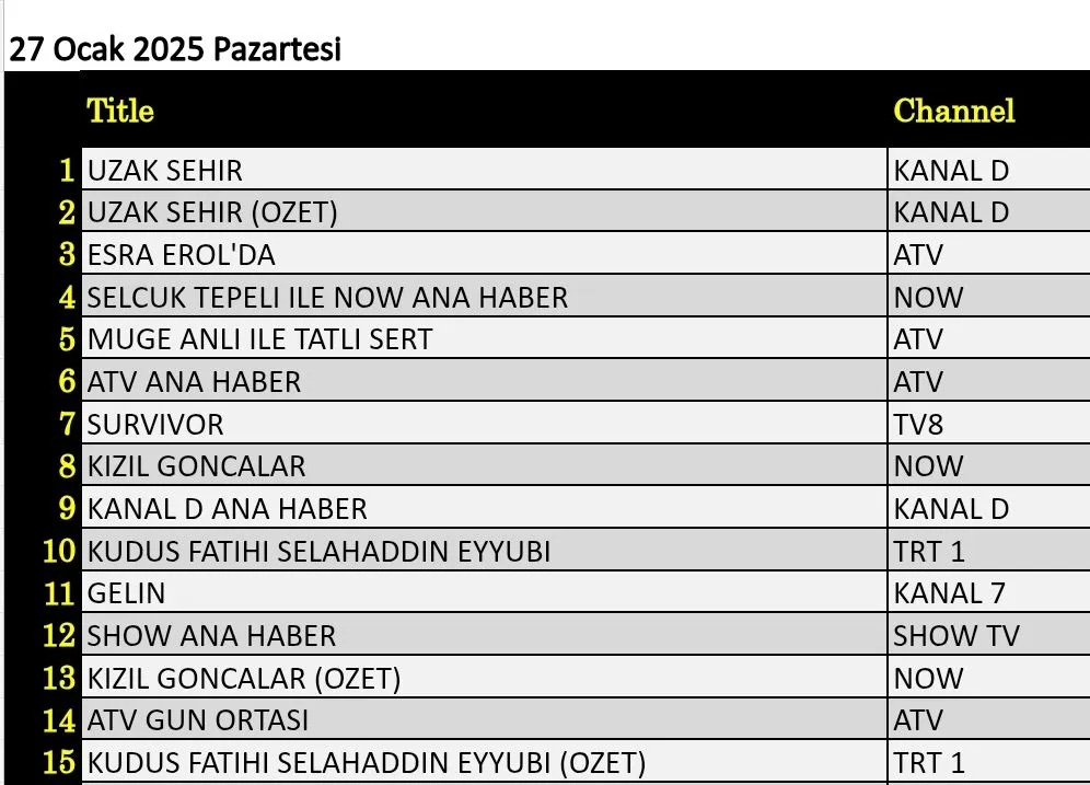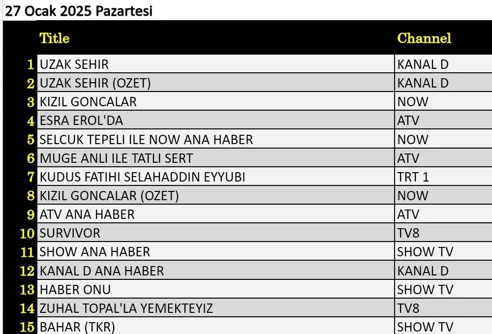 Total izleyici kategorisinde dün en çok izlenen yapım Kanal D'de yayınlanan ‘Uzak Şehir’ dizisi oldu. Dizinin özet bölümü ikinci sırada yer alırken, ‘Esra Erol’da' üçüncü, ‘Selçuk Tepeli ile Now Ana Haber’ dördüncü, ‘Müge Anlı ile Tatlı Sert’ ise beşinci sırada yer alan yapımlar oldu. ‘Survivor’ yeni bölümüyle listenin yedinci sırasında yer alırken, yeni bölümüyle ekrana gelen günün diğer dizileri ‘Kızıl Goncalar’ sekizinci, ‘Kudüs Fatihi Selahaddin Eyyubi’ ise onuncu sırada yer aldı.