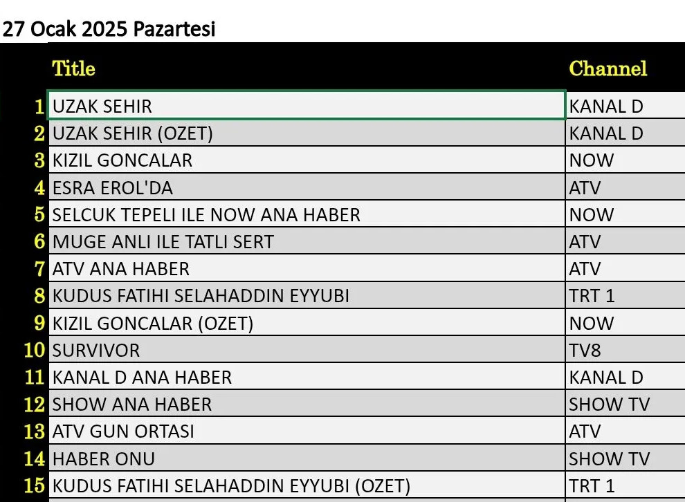 Reyting Sonuçları: 27 Ocak 2025 Pazartesi