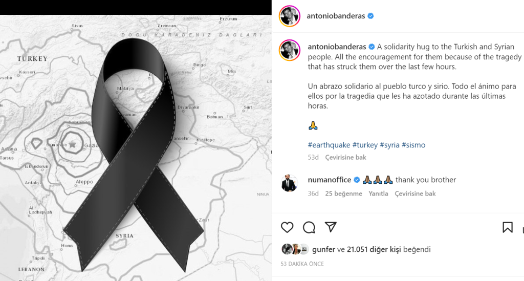 Türkiye’deki depreme duyarsız kalmayan isimlerden birisi de dünyaca ünlü İspanyol asıllı oyuncu Antonia Banderas oldu. Antonio Banderas paylaşımında : Türk ve Suriye halkına dayanışma dolu bir kucaklama. Son birkaç saattir başlarına gelen trajedi sebebiyle tüm kalbimiz onlarla..” ifadelerini kullandı..png)