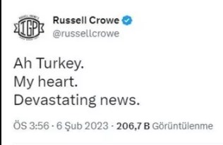 Yaşanan deprem afetinin hemen ardından Oscar ödüllü oyuncu Russel Crowe kendi şahsi twitter hesabından yaptığı paylaşımda ; “ Ah Türkiye...Kalbim…Haberler çok kötü…” diyerek duyduğu üzüntüyü dile getirdi. Çanakkale Savaşıyla ilgili çektiği Son Umut filminde Cem Yılmaz ve Yılmaz Erdoğan’a da yer veren Avustralya’lı usta oyuncu her fırsatta Türkiye sevgisini dile getirmekten geri durmuyor..jpg)