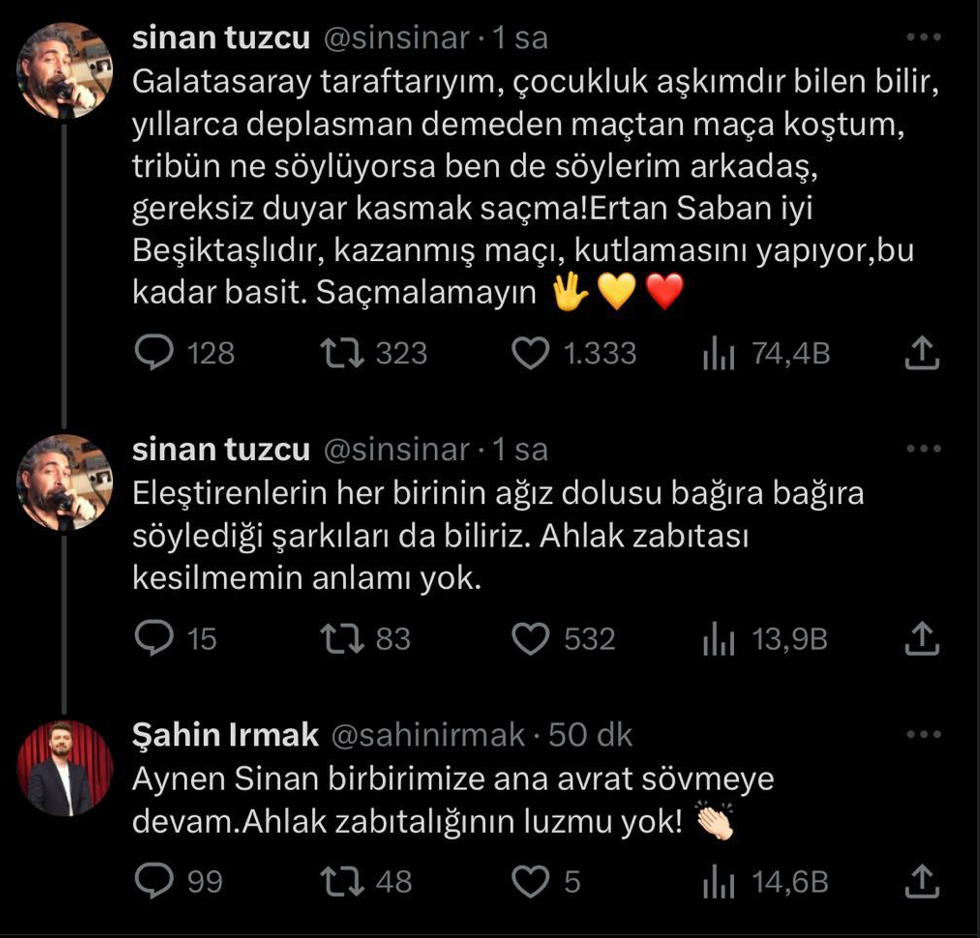 Şahin Irmak, Tuzcu’ya cevaben “Aynen Sinan birbirimize ana avrat sövmeye devam. Ahlak zabıtalığının lüzumu yok!” diyerek geri adım atmayacağının işaretini verdi. Özür dilediği halde hala üst perdeden kendisine cevap verilmesine içerleyen Saban “20 milyon kişinin aynı anda küfür ettiği derbilerde hayatında hiç küfür etmemiş gibi YARGI DAĞITANlar!!!! Böyle bir şeyden PRİM ELDE ETMEye çalışıp en büyük “y.v..lık”ı yapmaktan BAŞKA bir şey yapmıyorsunuz:):):)