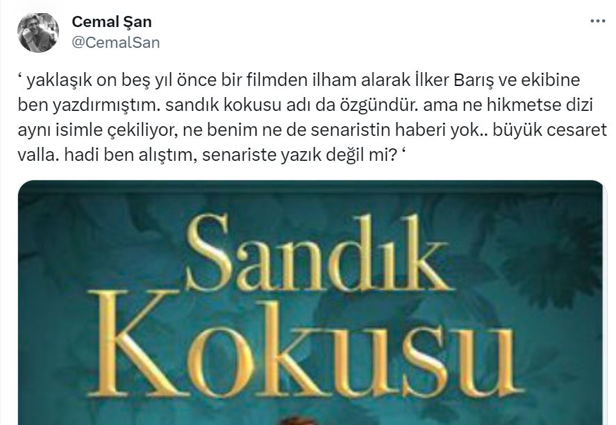 Show TV’nin yeni sezon dizilerinden Sandık Kokusu ile ilgili olarak ünlü yönetmen Cemal Şan’dan şok bir iddia geldi. Demet Akbağ, Özge Özpirinçci, Necip Memili ve Metin Akdülger gibi önemli isimleri kadrosunda bulunduran dizi için ünlü sinema yönetmeni Cemal Şan kendi sosyal medya hesabından paylaştığı tweetinde “Yaklaşık on beş yıl önce bir filmden ilham alarak İlker Barış ve ekibine ben yazdırmıştım. Sandık Kokusu adı da özgündür ama ne hikmetse dizi aynı isimle çekiliyor, ne benim ne de senaristin haberi yok. Büyük cesaret valla. Hadi ben alıştım, senariste yazık değil mi?” diyerek ortalığı karıştırdı.