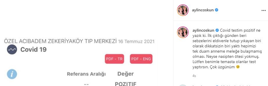 Aylin Coşkun Covid- 19 test sonucunu sosyal medya hesabından paylaştı. Coşkun'un paylaşımına ünlü isimlerden geçmiş olsun mesajları yağdı. Şarkıcı Hande Yener, "Allah’ın izniyle hiç bşy olmayacak Bitanem benim" yorumu yaptı. Şarkıcı Tuğba Özerk, "Çok geçmiş olsun canım benim" paylaşımı yaparken Pınar Dilşeker de "Acil şifalar canım, inşallah tez zamanda atlatırsın, çok geçmiş olsun" yorumunda bulundu.