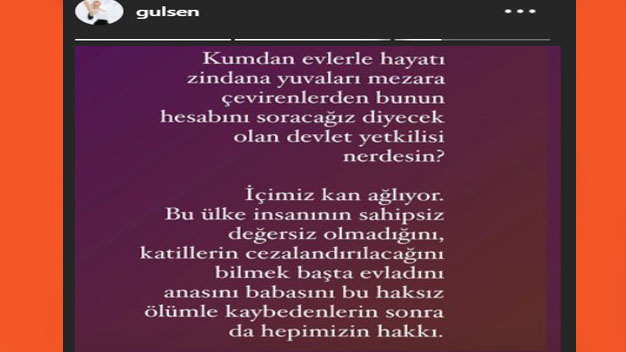 Ünlü şarkıcı Gülşen İzmir’de yaşanan depremin ardından sosyal medya hesabından bir paylaşımda bulundu. Gülşen paylaşımında “kumdan evlerle hayatı zindana yuvaları mezara çevirenlerden bunun hesabını soracağız diyecek olan devlet yetkilisi neredesin? İçimiz kan ağlıyor. Bu ülke insanının sahipsiz, değersiz olmadığını katillerin cezalandırılacağını bilmek başta evladını anasını babasını bu haksız ölümle kaybedenlerin sonra da hepimizin hakkı” ifadelerini kullandı. Bu sert çıkış bir anda şarkıcının takipçileri tarafından binlerce beğeni ve yorum alırken magazin dünyası da Gülşen’in bu çıkışını ilk sayfalarına taşıdı. Şarkıcı Gülşen’in bu sert çıkışı karşısında gereken açıklamaların ise kısa zamanda yapılacağı tahmin ediliyor.