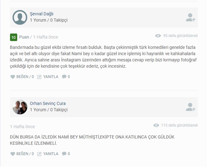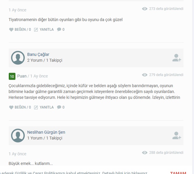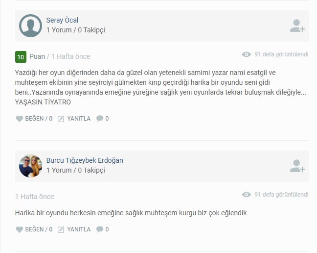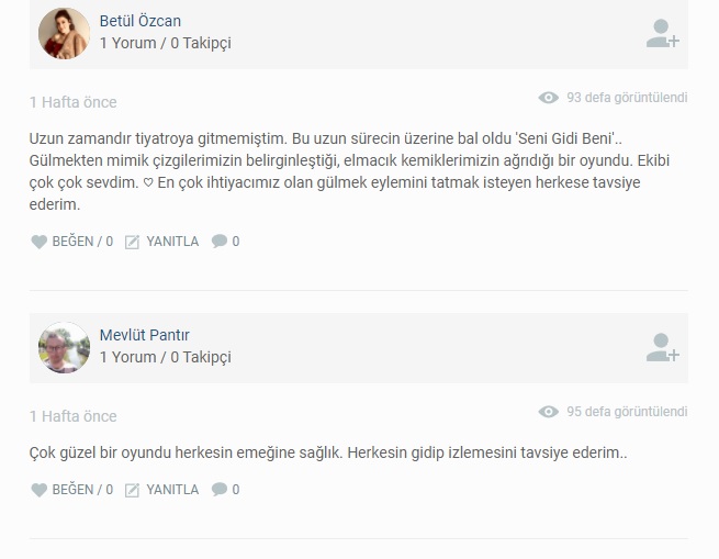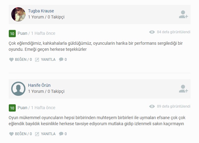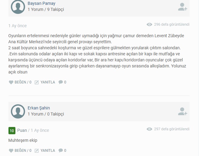 Kahkaha garantili oyun… Gittiği her şehirde büyük ilgi gören oyunun, her gösterim yapılacak salonu tıklım tıklım dolduran seyircileri gösteri sonunda oyuncuları ayakta alkışlıyor.