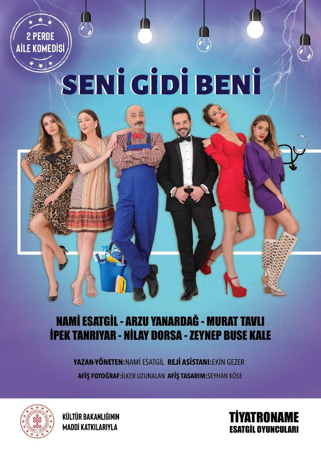 Seni Gidi Beni tiyatro oyununun senaryosunu ve yönetmenliğini Nami Esatgil’in yaptığı, Arzu Yanardağ, Murat Tavlı, İpek Tanrıyar, Nilay Dorsa, Zeynep Buse Kale’nin sahneye koyduğu 2 perdelik (120dk) aile komedisi tiyatroseverlerden büyük ilgi görüyor.