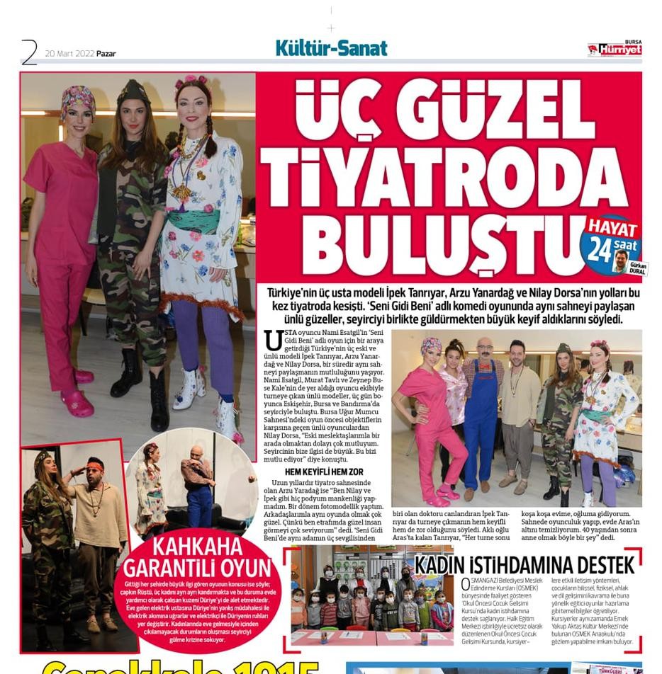 Türkiye’nin üç ünlü eski modeli İpek Tanrıyar, Arzu Yanardağ ve Nilay Dorsa’nın yolları bu kez tiyatroda kesişti. ‘Seni Gidi Beni’ adlı komedi oyununda aynı sahneyi paylaşan ünlü güzeller, seyirciyi birlikte güldürmekten mutluluk duyuyorlar.