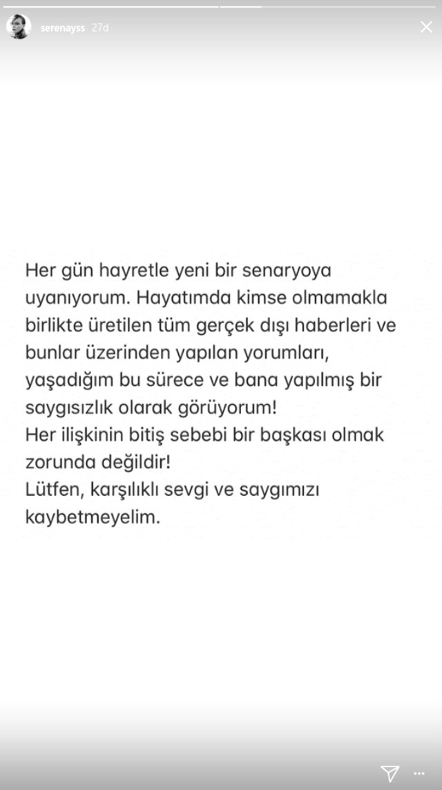 Ayrılığın ardından ilk kez konuşan oyuncu Serenay Sarıkaya sosyal medya hesabı İnstagram üzerinden şu açıklamalarda bulundu: ''Her gün hayretle yeni bir senaryoya uyanıyorum. Hayatımda kimse olmamakla birlikte üretilen tüm gerçek dışı haberleri ve bunlar üzerinden yapılan yorumları, yaşadığım bu sürece ve bana yapılmış bir saygısızlık olarak görüyorum! Her ilişkinin bitiş sebebi bir başkası olmak zorunda değildir! Lütfen karşılıklı sevgi ve saygımızı kaybetmeyelim!''