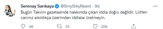 Rol arkadaşı Burak Deniz ile arasında aşk olduğu iddiasına ünlü oyuncu Serenay Sarıkaya anında tepki gösterdi. İddia sosyal medyada henüz yayılmıştı ki Sarıkaya, haberle ilgili açıklama yaptı. Ünlü şarkıcı ve oyuncunun sosyal medya hesabından yaptığı açıklamada şu ifadeler yer aldı: "Bugün Takvim gazetesinde hakkımda çıkan iddia doğru değildir. Lütfen canınız sıkıldıkça üzerimden iddialar üretmeyin."