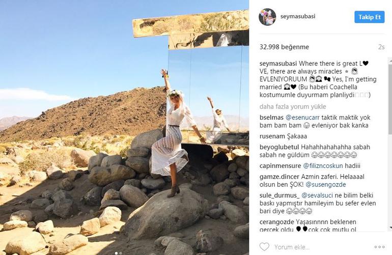 Uzun bir süredir Acun Ilıcalı le ilişkisini sürdüren Şeyma Subaşı Instagram hesabından evleneceklerine dair müjde verdi. İngilizce kelimelerle, Büyük aşkın olduğu yerde her zaman mucizeler vardır' sözlerini ekleyen Subaşı, takpçilerinden çok sayıda mesaj aldı.