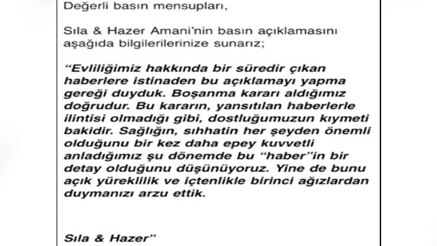 Tam bir yıl önce büyük ve hızlı bir aşkın sonunda nikah masasına oturan ve heyecanla evlenen ünlü çift şarkıcı Sıla ile Hazer Amani geçen bir yılın ardından boşanma kararı aldılar. Zor ve yorucu bir yıl geçiren ve bu süre içinde aralarında çeşitli sorunlar baş gösteren çift sonunda ayrılık noktasına kadar geldi. Özellikle pandemi zamanında evde vakit geçirilen zamanlarda çiftlerin birbirini daha yakından tanımaları ve aralarındaki ilişkinin tam olarak ortaya çıkmasıyla birbirleri için uygun olup olmadıklarına karar vermeleri sonunda çiftlerin görüşleri netleşti. Bu çiftlerden biri olan ve artık evli kalmamaya karar veren Sıla ile Hazer Amani geçtiğimiz aylarda boşanmaya karar vermişler ve bunun içinde mahkemeye başvurmuşlardı. Kasım ayında boşanacaklarını açıklayan ve bunu sosyal medya hesaplarından duyuran çiftin boşanma davasının tarihi belli oldu. Mahkeme boşanma tarihi olarak Şubat ayına karar verdi.