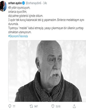 Usta oyuncu yılların emektarı Orhan Aydın sosyal medya hesabından bir paylaşımda bulunarak tiyatronun meslek olarak kabul etmemesini sert bir üslupla eleştirdi. Pek çok dizi ve sinema filminde de rol alan oyuncu paylaşımında “49 yıldır oyuncuyum. Onlarca oyun, film, dizi, sahne gösterisi içinde oldum. 3 aydır tek kuruş kazanacak tek iş yapmadım. Binlerce meslektaşım aynı durumda. Tiyatroyu ‘meslek’ kabul etmeyip, yasayı çıkarmayan bir ülkenin yurttaşı olmaktan utanıyorum” ifadelerini kullandı. Oyuncunun bu sert ifadelerle isyanı pek çok takipçisi tarafından yerinde bulunurken pek çok takipçisi de oyuncuyu bu sert üsluptan dolayı eleştirdi.