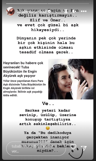 Kara Para Aşk ve Sefirin Kızı gibi birçok dizide rol arkadaşlığı yapan Tuba Büyüküstün ile Engin Akyürek'in yıllar önce aşk yaşadığı iddiası sosyal medyaya bomba gibi düştü. İkilinin yıllar önce olduğu gibi yeniden bir kez daha aşk yaşadığı iddiası üzerine oyuncu Tuba Büyüküstün alaycı bir cevap verdi. İşte o paylaşım: "Aşk yaşayan Engin ve ben değiliz karıştırmayın.. Elif ve Ömer.. ve evet çok güzel bi aşk hikayesiydi..Dünyanın pek çok yerinde bir çok kişinin hala bu aşkın etkisinde olması tesadüf olmasa gerek.."Bu dedikoduya gerçekten inanıyor musunuz?!!" demek için birkaç gün daha beklese miydim?.."