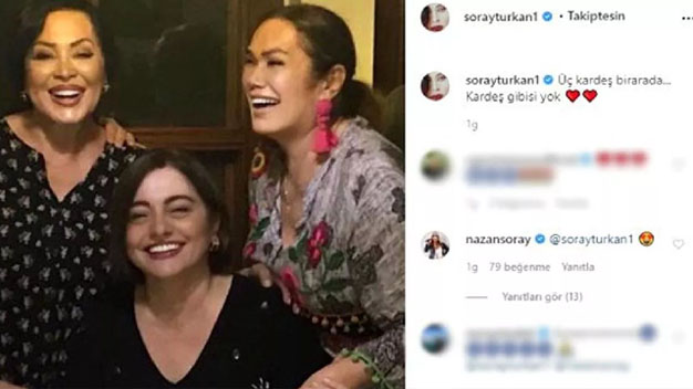 Türk sinemasının Sultan lakaplı usta oyuncusu Türkan Şoray yılar sonra sosyal medya hesabından bir paylaşımda bulundu. Pandemi günlerinde görüşemediği kız kardeşleriyle uzun uzun hasret giderdi ve bu anın fotoğrafını da sosyal medya hesabından “kardeş gibisi yok” ifadeleriyle sevenleri ve hayranlarıyla paylaştı. Bu paylaşım bir anda binlerce beğeni alırken usta oyuncu iki kız kardeşiyle birlikte olamadığı anların hasretini de uzun uzun giderdi. Kendinden küçük Nazan Şoray ve Figen Çevik Gezer isminde iki kız kardeşi daha olan üznlü isim yıllar sonra ilk kez sosyal medyada yer aldı.