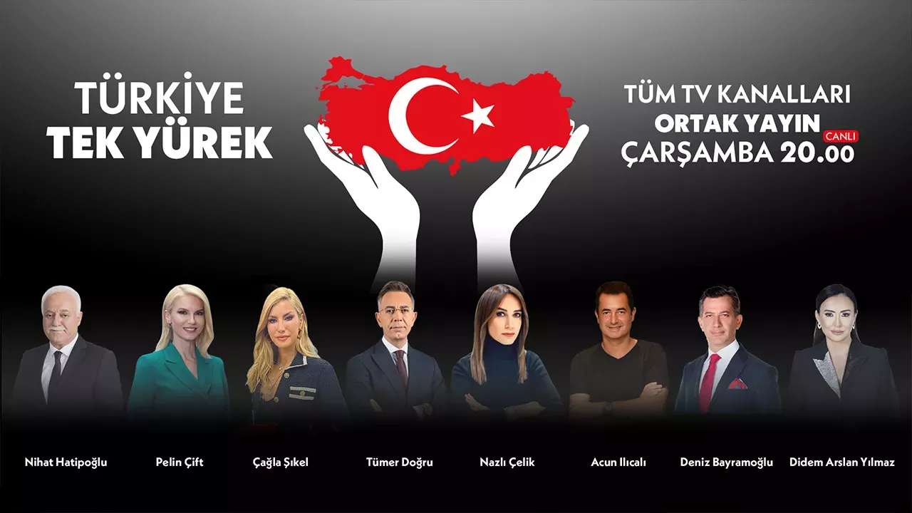 Duyurusu günler öncesinden yapılan Türkiye Tek Yürek Ortak yayını tüm kanallarının katılımıyla 15 Şubat Çarşamba akşamı saat 20.00’de başladı. Nihat Hatipoğlu, Pelin Çift, Çağla Şikel, Tümer Doğru, Nazlı Çelik, Acun Ilıcalı, Deniz Bayramoğlu, Didem Arslan Yılmaz moderatörlüğünde yapılan ortak yayınına sanat, iş ve spor dünyasının önde gelen isimleri destek olmak için katıldı. Zaman zaman canlı bağlantıların yapıldığı gecede ünlüler ve vatandaşlar depremzedelere maddi imkanlarıyla destek oldu. 7 saati aşan kampanyada Kıvanç Tatlıtuğ, Burak Özçivit, Merve Dizdar, Barış Falay, Binnur Kaya, Eda Ece, Ezgi Mola, Halit Ergneç, Aras İyinemli, Alişan, Esra erol, Müge Anlı, Serenay Sarıkaya, Kerem Alışık, Nihat Hatipoğlu, Acun Ilıcalıoğlu ve daha birçok ünlü isim telefonla vatandaşlardan yardım topladı.