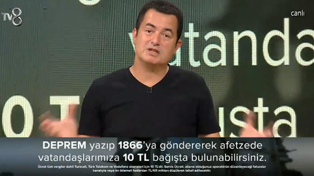 Geçtiğimiz akşam Tv 8 ekranlarında Acun Ilıcalı’nın sunduğu depremzedeler için hazırlanan programda tüm Türkiye depremden zarar görenlerin yardımına koştu ve ellerinden gelen yardımı yaptı. Bütün gece süren program sonunda depremzedeler için 51 Milyon Liradan fazla para yardımı yapıldı. 2 milyon 150 binden fazla SMS atılan programda telefonla yapılan yardımlarla birlikte toplam 51 Milyon liranın üstünde yardım toplandı. Acun Ilıcalı toplanan bu yardıma o gün TV 8’de yayınlanan reklam gelirlerinin de ekleneceğini açıkladı. Böylece yardımın miktarının 60 milyona ulaşacağı tahmin ediliyor. Programa yardımda bulunanlar arasında Dışişleri Bakanı Mevlüt Çavuşoğlu ve İçişleri Bakanı Süleyman Soylu’da yer aldı.