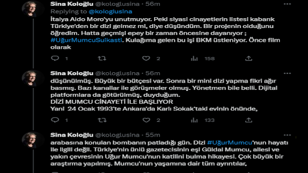 Ünlü gazeteci Sina Koloğlu sosyal medya hesabından yaptığı paylaşımla Uğur Mumcu dizisinin detaylarına değindi. Sina Koloğlu açıklamasında “siyasi cinayetlerin listesi kabarık Türkiye’den bir dizi gelmez mi diye düşündüm. Bir projenin olduğunu öğrendim. Hatta geçmişi epey bir zaman öncesine dayanıyor. Uğur Mumcu suikasti. Kulağıma gelen bu işi BKM üstleniyor. Önce film olarak düşünülmüş. Büyük bir bütçesi var. Sonra bir mini dizi yapma fikri ağır basmış. Bazı kanallar ile görüşmeler olmuş. Yönetmen bile belli. Dijital platformlara da götürülmüş, duyduğum. Dizi, Uğur Mumcu cinayeti ile başlıyor. Yani 24 Ocak 1993’te Ankara’da Karlı Sokak’taki evinin önünde, arabasına konulan bombanın patladığı gün. Dizi Uğur Mumcu’nun hayatı ile ilgili değil. Türkiye’nin ünlü gazetecisinin eşi Güldal Mumcu, ailesi ve yakın çevresinin Uğur Mumcu’nun katilini arama hikayesi. Çok büyük bir araştırma yapılmış. Bu dizi hayata geçecek gibi görünüyor” ifadelerini kullandı.