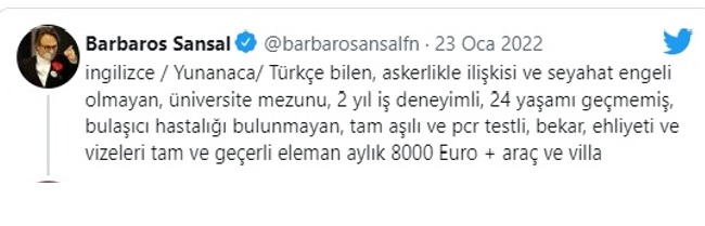 Olay açıklamalarıyla sıklıkla gündeme gelen modacı Barbaros Şansal, bu sefer de sosyal medya hesabından verdiği iş ilanı ile gündem oldu. Araç+ villa+ 8000 Euro maaş