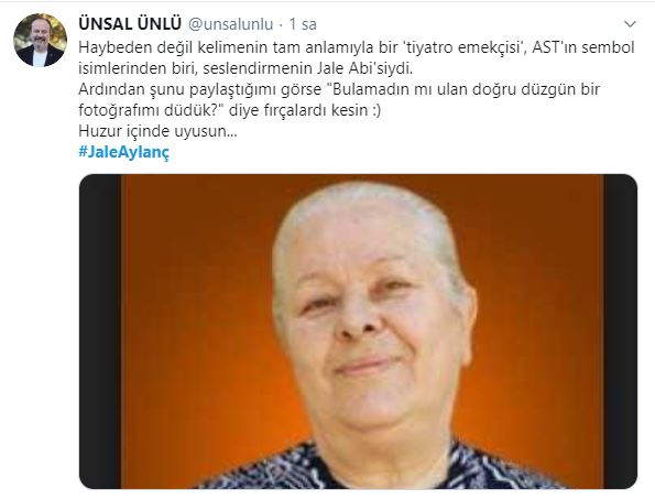 Gazeteci ve seslendirmen Ünsal Ünlü de Jale Aylanç'ın vefat haberi üzerine paylaşım yapan isimlerden biri oldu. Ünlü şunları yazdı; "Haybeden değil kelimenin tam anlamıyla bir 'tiyatro emekçisi', AST'ın sembol isimlerinden biri, seslendirmenin Jale Abi'siydi. Ardından şunu paylaştığımı görse "Bulamadın mı ulan doğru düzgün bir fotoğrafımı düdük?" diye fırçalardı kesin. Huzur içinde uyusun..."