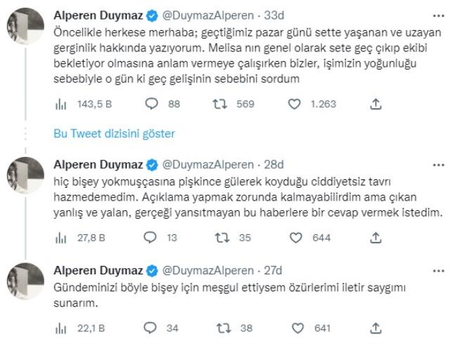 Ünlü ve genç oyuncu Alperen duymaz yaşananların ardından yaptığı açıklamada ayrıca kendi haklarını korumaya çalıştığını da belirtti ve “ben haklarımı korumaya çalıştım ve çalışıyorum. İnsanlar işlerinin gerektirdiği saatlerde işlerinde olurlar, herhangi bir aksaklıkta da açıklama yaparlar. Tüm ekibin hazır bir şekilde Melisa’yı beklemesini ve Melisa’nın hiçbir şey yokmuşçasına pişkince gülerek koyduğu ciddiyetsiz tavrı hazmedemedim. Açıklama yapmak zorunda kalmayabilirdim ama çıkan yanlış ve yalan, gerçeği yansıtmayan bu haberlere bir cevap vermek istedim. Gündeminizi böyle bir şey için meşgul ettiysem özürlerimi iletir saygımı sunarım” ifadelerini kullandı. Öbür taraftan EGO setinde çalışanlardan bazılarının da kendilerine verilen sözlerin tutulmadığı gerekçesiyle iş bırakma eylemi işten çıkarmayla son buldu ve bu çalışanlar da bir açıklama ile durumu magazin basınında gündeme getirdiler.