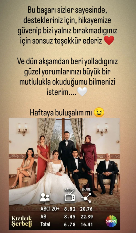 Show Tv ekranlarında Cuma akşamları ekrana gelen ve Gold Film tarafından hazırlanan Kızılcık Şerbeti haftaya damgasını vurdu ve Cuma gününün en çok seyredilen yapımı olmayı başardı. Birbirinden ünlü isimlerin yer aldığı dizide Kadrosunda Sıla Türkoğlu, Ceren Karakoç, Barış Kılıç gibi ünlü isimlerin yer aldığı dizide Nursema karakterine hayat veren Ceren Karakoç dizinin aldığı reytingin ardından sosyal medya hesabından bir paylaşımda bulundu. Ünlü isim paylaşımında “bu başarı sizler sayesinde, destekleriniz için, hikayemize güvenip bizi yalnız bırakmadığınız için sonsuz teşekkür ederiz. Ve dün akşamdan beri yolladığınız güzel yorumlarınızı büyük bir mutlulukla okuduğumu bilmenizi isterim. Haftaya buluşalım mı” ifadelerini kullandı.