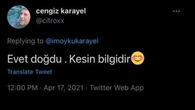 Birçok dizide ve sinema filminde rol alan ve oldukça başarılı bir performans gösteren ve yapımcıların vazgeçemediği oyunculardan olan Öykü Karayel ile özellikle genç kitlenin çok sevdiği ve şarkılarını dillerinden düşürmediği müzisyen Can Bonomo’nun bugün bir erkek bebekleri dünyaya geldi. 33 yaşındaki can Bonomo ile 30 yaşındaki güzel oyuncu Öykü Karayel dünyaya gelen erkek bebeklerine aylar önce adını koymuşlardı. Bugün ise resmen Roman bebek dünyaya geldi ve anne babasının kucağındaki yerini aldı. Bu mutlu haberin magazin sayfalarında ve sosyal medyada yer alması üzerine Öykü karayel’in babası Cengiz Karayel sosyal medya hesabından bir paylaşımda bulundu ve doğumu esprili bir dille doğruladı. Dede olan Cengiz Karayel paylaşımında “evet doğdu. Kesin bilgidir” ifadelerini kullandı.