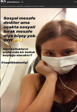 Güzel ve başarılı oyuncu Gizem Karaca uzun süre kendini evinde karantinaya aldıktan sonra normalleşme sürecinde uçakla bir yolculuk yaptı. Ancak ne olduysa bununla birlikte oldu. Karantina sürecini evinde geçiren ve normal hayata adım atarken de sosyal mesafe kuralını azami ölçüde uygulayan Gizem Karaca yolculuk yaptığı bir havayolu şirketinin sosyal mesafeye uymadığını iddia ederek sosyal medya hesabından bir paylaşımla şikayetini dilde getirdi ve ayrıca şirketi sağlık bakanlığına şikayet etti. Yolculuk sırasında uçakta cam kenarında otururken çektiği bir selfiesini paylaşan güzel oyuncu bu karenin üzerine “sosyal mesafe dediler ama uçakta sosyali bırak mesafe diye bir şey yok off! Hani koltukların aralarında bir koltuk boşluk olacaktı?” ifadelerine yer verdi. Paylaşımında Sağlık Bakanlılığı’nı da etiketleyen oyuncunun paylaşımına birçok beğeni ve yorum yapıldı.