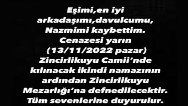 Ünlü şarkıcı, pop müziğinin emektar ismi Zeliha Sunal dün kalp krizi sonrası eşi Nazmi Sunal’ı kaybetti. Nazmi Sunal’ın kalp krizi sonrası hayata veda etmesini eşi Zeliha Sunal sosyal medya hesabından duyurdu. Zeliha Sunal yaptığı paylaşımda “eşimi, en yakın arkadaşımı Nazmi’mi kaybettim” ifadelerini kullandı. Ünlü şarkıcı ayrıca Nazmi Sunal’ın naaşının toprağa verileceği günü ve yeri de paylaşımında belirtti. Ünlü şarkıcı Zeliha Sunal’ın eşi Nazmi Sunal’ın cenazesi Pazar günü ikindi namazının ardından kılınan cenaze namazının ardından Zincirlikuyu Mezarlığı’nda toprağa verildi. Ünlü şarkıcı Zeliha Sunal’ın eşini kaybetmesi dolayısıyla oldukça üzgün olduğu gözlenirken sevenleri ve yakınları ünlü şarkıcıyı bu zor anında yalnız bırakmadı.