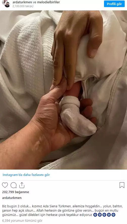 Instagram'da 2,1 milyon takipçisi bulunan Arda Türkmen, yaptığı paylaşımla baba olmanın mutluluğunu hayranlarıyla paylaştı. Kızının ayağını paylaşan Türkmen bebeğin ismini de açıkladı: Biz bugün 3 olduk… kızımız Ada Siena Türkmen, ailemize hoş geldin… yolun, bahtın, şansın hep açık olsun… Allah herkesin de gönlüne göre versin… bugün en mutlu günümüz… güzel dilekleri için herkese çok teşekkür ediyoruz"