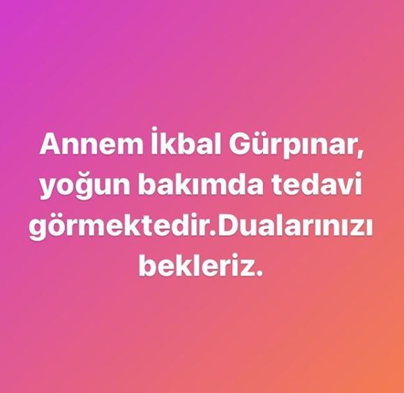 Ünlü sunucu İkbal Gürpınar, Eylül ayında babası Murtaza Dönmez'i de koronavirüs sebebiyle kaybetmişti. Daha sonra kendisi salgına yakalanan İkbal Gürpınar'ın yoğun bakıma alındığı haberi oğlu tarafından duyuruldu. Annesinin İnstagram hesabından bir paylaşım yapan Alper, yaptığı paylaşıma şu notu yazdı; "Oğlu Alper olarak annemin sayfasından yazıyorum. Annem İkbal Gürpınar, corona sebebiyle yoğun bakımda tedavi görmektedir. Dualarınızı bekleriz."