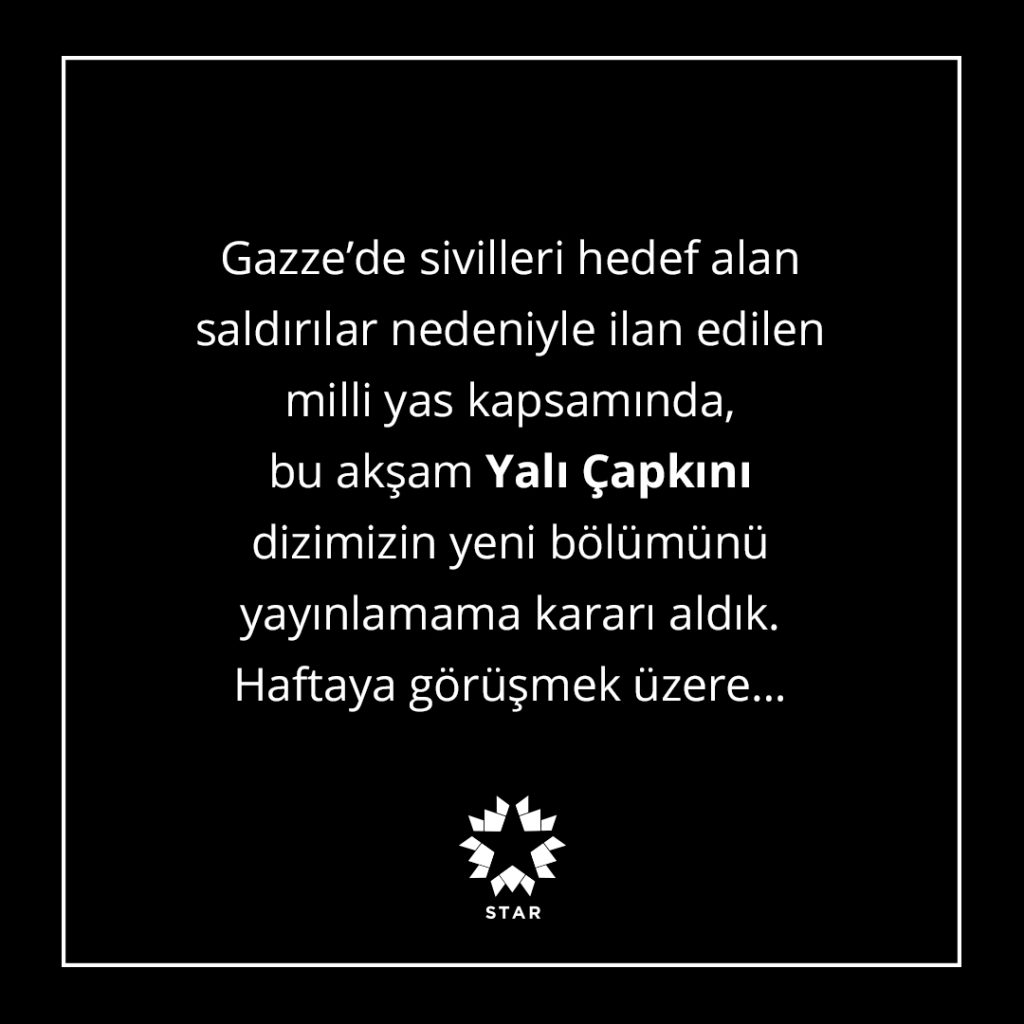 Geçen sezonki performansı ile reyting rekorlarını alt üst eden Yalı Çapkını dizisi 20.10.2023 Cuma akşamı saat 20.00’de yayınlanması gerekirken yerine İp Man 4 Final filmi yayınlandı. Seyirci dört gözle Yalı Çapkını dizisini beklerken yabancı bir sinema filmi ile karşılaşınca çok şaşırdı. Show TV’de Kızılcık Şerbeti dizisi yayınlanırken Star TV’de Yalı Çapkını niye yayınlanmadı diye merakla bekleyen dizi takipçileri bu konu hakkında kafalarında oluşan soru işaretini cevaplamaya çalıştılar. Konu ile ilgili olarak dizinin iptali ile ilgili olarak Star TV “Gazze’de sivilleri hedef alan saldırılar nedeniyle ilan edilen milli yas kapsamında, bu akşam Yalı Çapkını dizimizin yeni bölümünü yayınlamama kararı aldık. Haftaya görüşmek üzere…” ifadelerini kullandı.