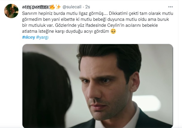 ‘’Sanırım hepiniz burda mutlu Ilgaz görmüş… Dikkatimi çekti tam olarak mutlu görmedim ben yani mutlu bebeği duyunca mutlu oldu ama buruk bir mutluluk var. Gözlerinde yüz ifadesinde Ceylin’in acılarını bebekle atlatma isteğine karşı duyduğu acıyı gördüm.’’