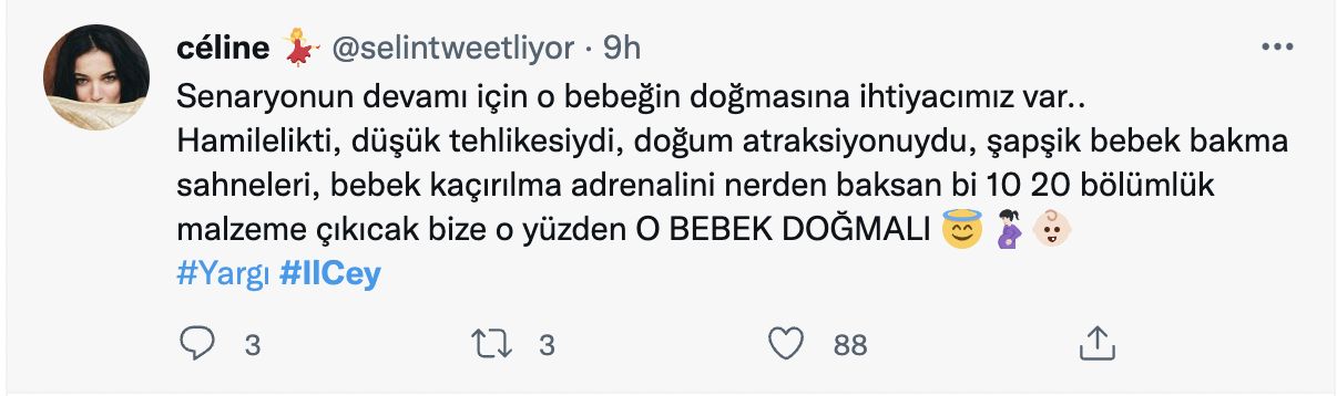 ‘’Senaryonun devamı için o bebeğin doğmasına ihtiyacımız var... Hamilelikti, düşük tehlikesiydi, doğum atraksiyonuydu, şapşik bebek bakma sahneleri, bebek kaçırılma adrenalini nerden baksan bi 10-20 bölümlük malzeme çıkıcak bize o yüzden O BEBEK DOĞMALI’’