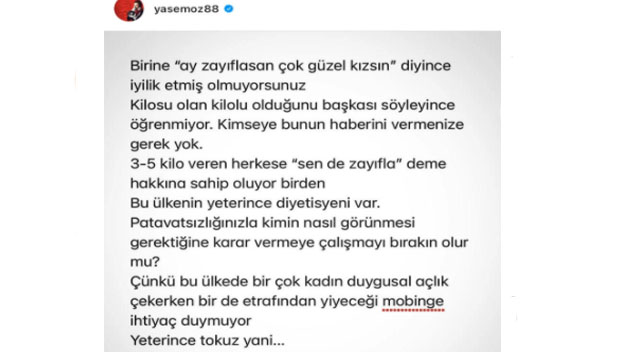 Sosyal medya ortaya çıktığı ve ünlü isimlerin takipçileri bu isimlere çok kolay ulaşmaya başladığından beridir sık sık karşı karşıya geliyorlar. Ünlü isim ile hayranları arasında yaşanan bu tartışmalar, öfkeler sık sık magazin basını ve sosyal medyanın da gündemine geliyor. Daha çok takipçilerin ünlü isimler hakkında yaptıkları yorumlarla başlayan bu karşılıklı tartışmaya bugünlerde bir yenisi daha eklendi. Ünlü komedyen ve oyuncu Yasemin Sakallıoğlu ile sosyal medyadan kendisini takip eden bir hayranı arasında istenmeyen bir tartışma yaşandı. Ünlü isim Yasemin Sakallıoğlu sosyal medya hesabı üzerinden kendisine “zayıflasan güzel kızsın” diyen bir takipçisinin bu ifadeleri karşısında adeta isyan etti ve o da yine sosyal medya hesabı üzerinden manifesto niteliğinde bir paylaşımda bulundu.