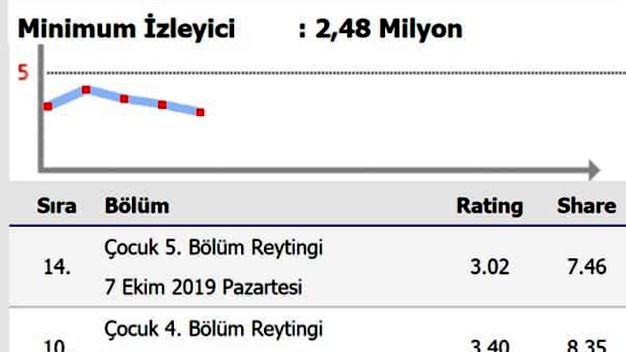 1441 yapımın yeni dizisi Çocuk başlarda pazartesi günleri yayınlanıyordu. Reytingler kötü gidince yayın günü değiştirildi ve Salı gününe kaydırıldı. Çocuk dizisi ilk bölümlerden itibaren aldığı düşük reytingler ile Star Tv’nin hayal kırıklığı yaşatan dizilerinden biri oldu. Birkaç haftalık reytingleri dikkatli incelediğimizde Çocuk dizisinin Çukur, Yasak Elma ve Zalim İstanbul karşısında tutunamadığı açıkça görülüyor. Hal böyle olunca dizi final kararı aldı.
