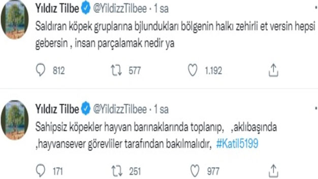 Ünlü şarkıcı Yıldız Tilbe geçtiğimiz günlerde sokak köpeklerinin insanlara saldırması ve peş peşe yaralanmalar ve hatta can kayıpları yaşanması üzerine sosyal medya hesabından bir paylaşımda bulunmuş ve “saldıran köpek gruplarına bulundukları bölgenin halkı zehirli et versin, hepsi gebersin! İnsan parçalamak nedir ya?” ifadelerini kullanmıştı. Bunun üzerine aralarında ünlülerin de olduğu pek çok kişi Yıldız Tilbe’ye sert bir tepki göstermiş ve Tilbe’yi sözlerinden dolayı eleştirmişlerdi. Bunun üzerine Yıldız Tilbe yine sosyal medya hesabından başka paylaşımlarda bulunarak, sözlerini yumuşatmış ve hatta masum köpeklerden özür dilerim ifadelerini kullanmıştı. Ancak tepkiler durmamış hatta çığ gibi büyümüştü. Özellikle pek çok ünlü Yıldız Tilbe’yi sert eleştiren paylaşımlarda bulunmuşlardı.