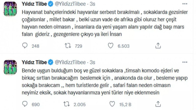 Ünlü isim bir diğer paylaşımında ise yine kendini eleştirenleri ti’ye alarak yeni hayvanların sokaklara salınmasını istedi. Yıldız Tilbe “ben de uygun bulduğum boş ve güzel sokaklara, timsah, komodor ejderi ve birkaç sırtlan bırakacağım beslemek için. Anakonda da olur, besleme yapıp sokağa bırakacağım. Hem turistler de gelir, safari falan neden olmasın, neyimiz eksik? Sokak hayvanlarımıza yeni türler niye eklenmesin?” ifadelerini kullandı. Ünlü ismin bu son çıkışı her zaman olduğu gibi sosyal medyada ve magazin basınında geniş yer aldı. Pek çok kişi ünlü ismi yine eleştiri yağmuruna tutmaya başladı.