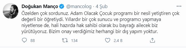Doğukan Manço Twitter hesabından, "Özelden çok sordunuz. Adam Olacak Çocuk programı bir nesil yetiştiren çok değerli bir öğretiydi. Yıllardır birçok sunucu ve programcı yapmaya niyetlense de, hali hazırda hak sahibi olarak bu bayrağı ailecek biz yürütüyoruz. Bizim onay verdiğimiz herhangi bir dış yapım yoktur" mesajını paylaştı.